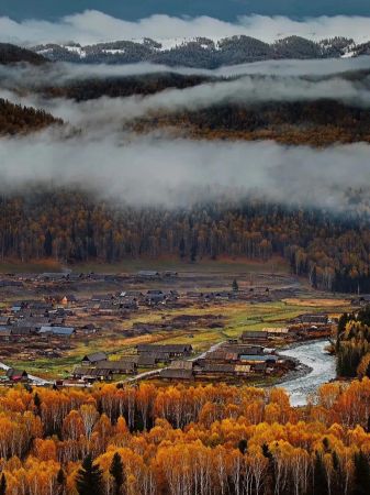 今日亮點(diǎn):中國最美的六大鄉(xiāng)村古鎮(zhèn)”之禾木村落,木屋、柵欄、牛羊、金黃的白樺林,映襯銀色雪山。任何一個(gè)位置放眼所望,都是熱烈而明朗的金黃色,層林盡染,絢麗多彩。河流、牧群、木屋、晨光、暮色、晨霧、炊煙、雪山、溪流、白樺林相輔相襯如詩如畫,童話的世界、與世隔絕的禾木村。